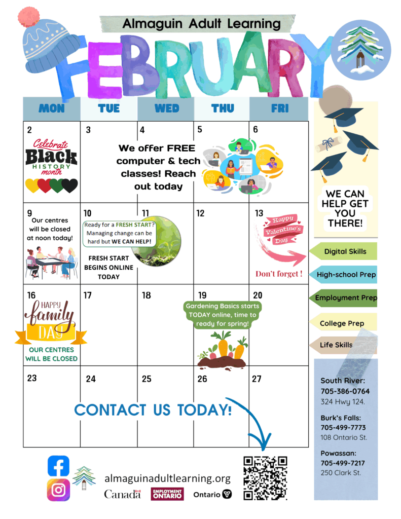 February Almaguin Adult Learning Centre Calendar