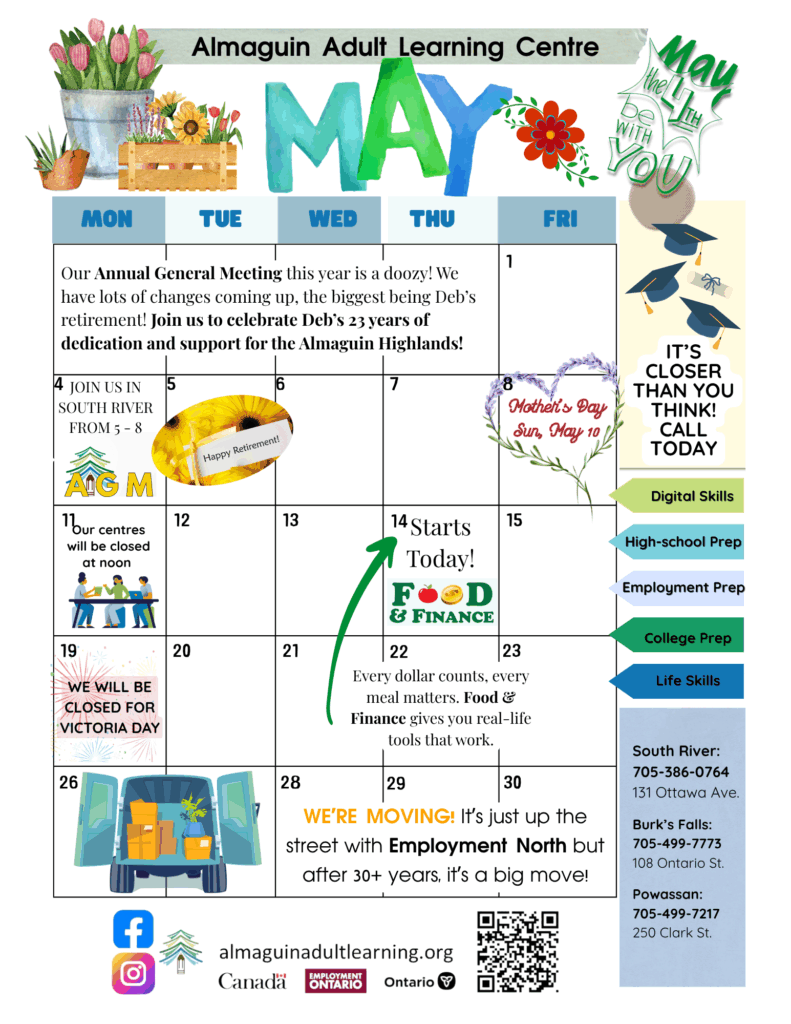 May Almaguin Adult Learning Centre Calendar